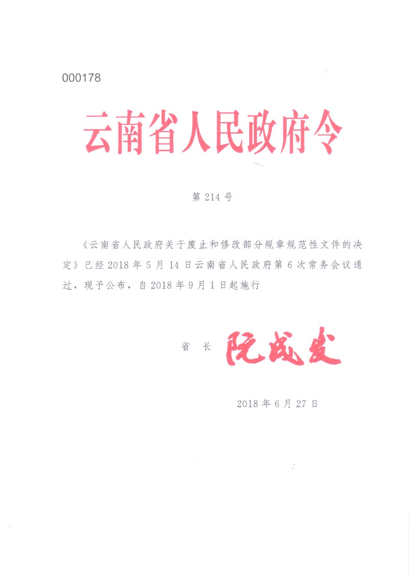 云南省人民政府关于废止和修改部分规章规范性文件的决定(第214号)