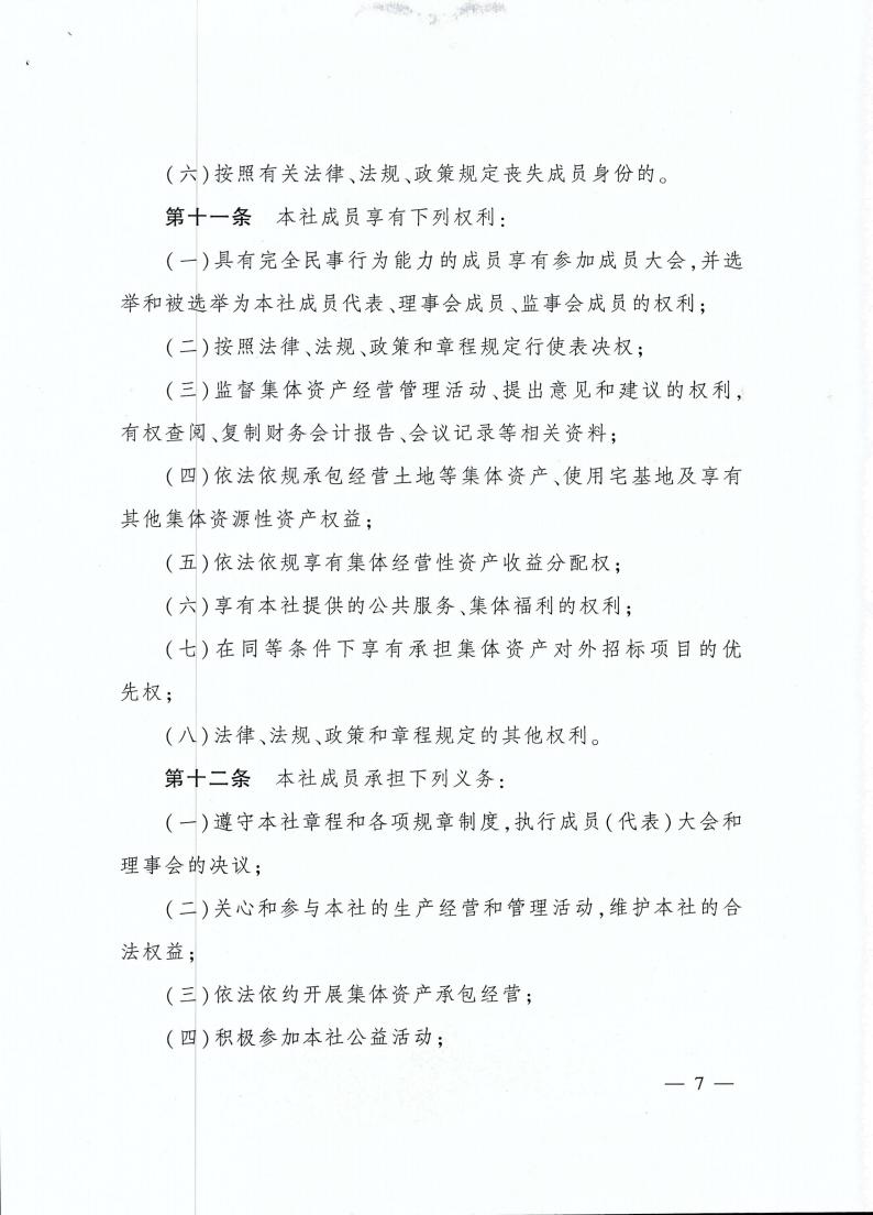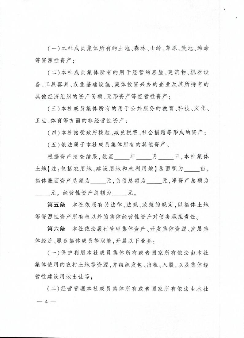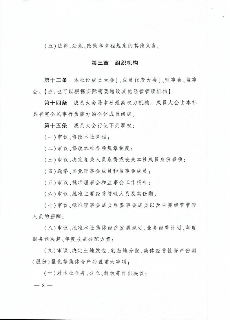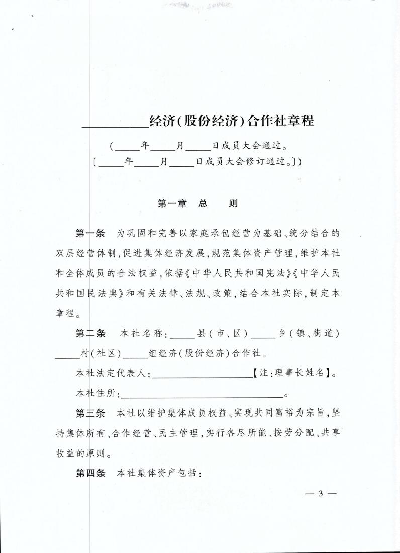 云南省农业农村厅关于转发《农村集体 经济组织示范章程(试行)》的通知 各州、市农业农村局: 现将《农业农村部关于印发〈农村集体经济组织示范章程(试行)〉的通知》(农政改发〔2020〕5号)转发给你们,请按照要求,抓好贯彻落实。 云南省农业农村厅 2021年2月20日 农业农村部关于印发 《农村集体经济组织示范章程(试行)》的通知 各省、自治区、直辖市农业农村(农牧)厅(局、委): 为促进农村集体经济组织规范发展,保障农村集体经济组织及其成员的合法权益,依据《中华人民共和国民法典》以及国家有关法律法规政策,我部拟定了《农村集体经济组织示范章程(试行)》,现予以印发。请各地参照本示范章程,指导农村集体经济组织制定或完善其章程。 农业农村部 2020年11月4日