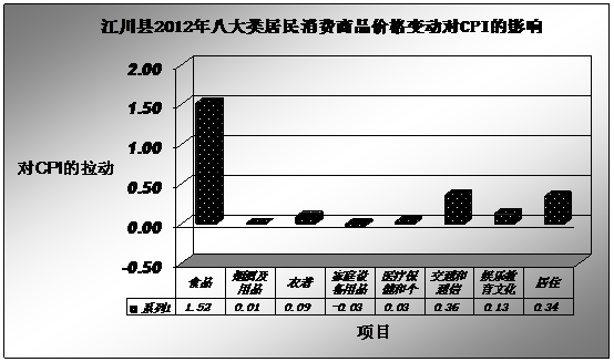 附:2012年江川县居民消费价格指数(CPI)同期比走势、江川县2012年八大类居民消费商品价格变动对CPI的影响