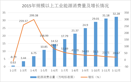(一)规模以上工业能源消费量高开低走。今年全县规模以上工业能源消费2月负增长,从3月开始持续3位数增长,四月份增幅达到全年最高,5月份开始增幅逐月回落,全县规模以上工业能源消费总量呈“高开低走”态势,2015年全县规模以上工业能源消费量达32.28万吨标准煤,同比上升20.67%。