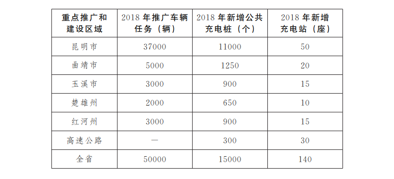 充电基础设施建设目标。按照“桩站先行、适度超前”的原则建设充电基础设施,重点在昆明市、曲靖市、玉溪市、楚雄州、红河州等滇中城市群和旅游城市及景区,加快布局建设充电基础设施,2018年昆明等滇中城市群及城际高速公路新增公共充电桩1.5万个,集中式充电站新增140座以上。其他州、市根据新能源汽车推广情况,积极推进充电基础设施建设。