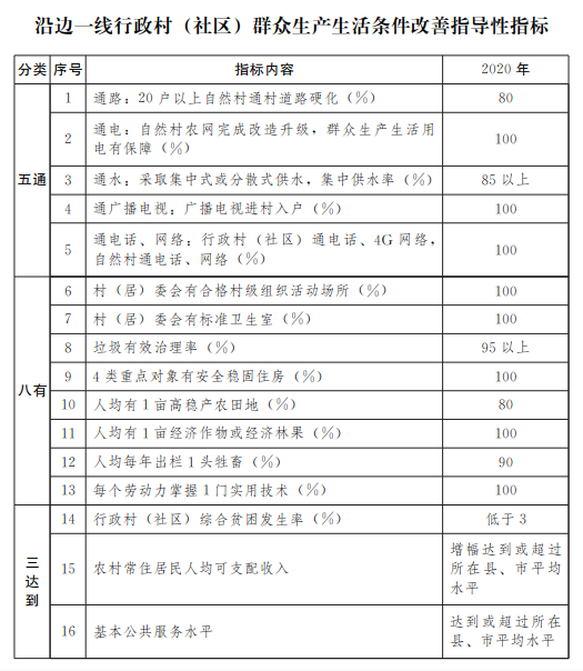 ——村寨建设。按照“五通八有三达到”目标,对373个抵边行政村(社区)、19个沿边农场进行巩固提升,对505个非抵边行政村(社区)按照“缺什么补什么”原则进行建设。到2020年,沿边建档立卡贫困户精准脱贫,农村常住居民人均可支配收入增幅达到全县平均水平,交通出行、饮水安全等基础设施进一步改善,特色产业促进就业和增收能力进一步增强,沿边一线行政村(社区)全部实现“五通八有三达到”目标。