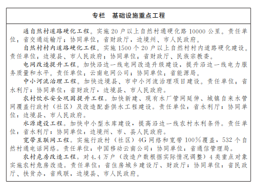(二)加强基础设施建设 1.道路建设。加快通村路、巡逻路、产业路、旅游路建设,推进抵边自然村通硬化路建设,到2020年末完成沿边一线20户以上自然村通硬化路目标。实施沿边一线危桥改造、县乡道改造、窄路面公路扩宽改造、县乡客运站改造等工程,力争边境乡镇公路达到四级公路标准。 2.电网改造。加快沿边一线电网改造升级工程建设,进一步提高农村地区供电可靠率和综合电压合格率,提升沿边一线电力服务质量和水平。贯彻落实《云南省城乡居民生活用能实施电能替代价格方案》,实施以电代柴,逐步实现农村家庭电气化。 3.水利建设。加快水源建设,实施高效节水灌溉、山区“五小水利”和农村饮水安全巩固提升等民生水利工程,提高沿边一线农村水利条件。加快边境县、市中小河流治理项目建设。加快建设一批乡镇集中供水工程,对分散供水或水质不达标的供水点实施升级改造。对人口相对密集、距离城镇化供水管网较近的村庄,通过实施扩容改造和管网延伸工程集中供水。 4.通信网络。加强信息和网络基础设施建设,拓展宽带和4G网络覆盖广度和深度,推进实施边境乡镇行政村(社区)通宽带、自然村和重要交通沿线通信信号覆盖工程。完善边防边控通信设施,提高应急通信保障能力。实现边境乡镇行政村(社区)广播电视网络全覆盖。不断提高农村地区通信接入能力。加强行政村(社区)邮政设施建设,实现建制村100%通邮。 5.危房改造。鼓励沿边常住居民抵边居住,加快推进沿边一线农村危房改造工程建设,聚焦解决低保户、农村分散供养特困人员、贫困残疾人家庭和建档立卡贫困户等4类重点对象的危房改造问题。按照消除直接危险,同步提高房屋整体强度的要求,科学实施危房改造,确保质量安全。加大力度支持沿边一线公立医疗卫生机构医务人员、乡村学校教师周转房及配套设施建设。
