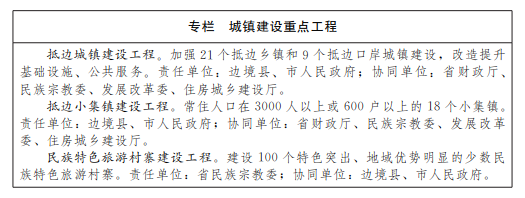 二、主要任务和重点工程 (一)支持沿边集镇建设 1.优化城镇发展布局和形态。加快抵边乡村建设规划编制,统筹落实乡村建设规划目标、乡村用地、乡村重要设施、乡村风貌、农房建设管理、村庄整治等任务。打造一批休闲旅游、商贸物流、民族文化、民族风情等服务农村、带动周边的特色抵边乡镇。发展一批具备一定人口规模和集市功能、交通便利,且周边10公里范围内无城镇的特色小集镇。 2.增强城镇市政功能和产业支撑。完善抵边乡镇基础设施和基本公共服务设施,提升综合配套服务能力,打造宜居宜业环境。推动村镇建设与特色优势产业发展相结合,因地制宜发展旅游、商贸、物流、文化、加工等产业。