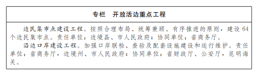 (五)提升开放活边水平 1.加强边境互市点、边民集市点建设。加强互市点及其周边基础设施建设,有序推进边民互市点发展升级。鼓励互市点完善“二级市场”,形成专业化的仓储、物流、集散、加工中心。改善边民贸易条件,建设一批边民集市点。探索互助合作社、“边民互市+加工”“边民集市+加工”等发展模式。 2.口岸(通道)基础设施建设。加快口岸(通道)和通关便利化基础设施建设,以联检设施、物流仓储、查验货场等为重点,推进新开口岸和重点通道建设,提高管理水平、服务质量和通行效率。重点建设瑞丽、河口、磨憨、猴桥、清水河等一类口岸,继续加大勐满、关累等拟新开口岸建设和木城、龙富等通道建设投入力度。 3.开发开放平台建设。加强重点开发开放试验区、边(跨)境经济合作区、综合保税区建设。加大招商引资力度,推动一批企业在沿边一线落户发展,按照区位和资源优势,将各类开发开放平台建设成为集加工贸易、特色农产品商品交易、物流仓储、跨境旅游、跨境电子商务等于一体的综合经济功能区。
