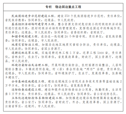 (六)加强稳边固边建设 1.民族团结进步示范建设。深入开展爱国主义和民族团结宣传教育,扎实推进民族团结进步示范村、民族团结进步示范户等建设。贯彻党的宗教工作基本方针,引导宗教团体、宗教活动场所和广大信教群众为稳边固边和沿边一线发展服务,鼓励开展和谐寺观创建活动。推进“互联网+民族团结”,加大对民族类宣传媒体支持力度。 2.沿边一线基层治理。发挥基层党组织的战斗堡垒和党员的先锋模范作用,积极引导边民树立爱国爱党守土固边的责任感和荣誉感。配强驻村工作队,发挥其带领群众学习现代生产技能、培养健康文明生活方式的作用。对沿边一线所有行政村(社区)选派第一书记。推进村民小组活动场所建设,确保每个村民小组都有可供使用的活动场所。 3.社会帮扶协作。鼓励和组织国有企业、民营企业、社会组织、公民个人到沿边地区兴业创业、吸纳就业、捐资助贫,开展各类经济技术交流活动,积极参与沿边一线建设。加强行业扶贫重点帮扶、社会扶贫协同帮扶,发挥沪滇粤滇扶贫协作、中央单位定点扶贫、军队和武警部队参与扶贫的优势,动员社会力量广泛参与,形成资源整合、力量集成的扶贫合力。 4.生态环境保护。强化沿边一线重点生态建设,加强地质灾害综合防治。实施退耕还林还草工程,实现“应退尽退”。生态管护岗位优先安排沿边一线建档立卡贫困边民,落实好管护任务和补助资金。加强沿边动植物疫病防控,防范动植物疫情跨境传播。加强城乡环境综合整治,加大农业面源污染防治。强化沿边一线环境监管能力建设。 5.农村环境综合整治。大力治理村庄垃圾,加强垃圾和污水处理等工程建设,完成较大规模非正规垃圾堆放点整治。开展农村公用卫生厕所建设和改造,同步实施厕所污水和粪便治理,厕所污水和粪便得到处理或资源化利用。提升进村入户通达水平,实施村庄建筑风貌整治及亮化美化绿化工程。 6.平安沿边建设。加强边防信息化建设,加大对边防检查设施和装备的投入力度。建立边民身份认证制度和边民补助动态调整机制,巩固沿边一线群众基础。加强群众性管边队伍建设,落实好护边员、外事界务员等管边护边队伍的经费补助。支持友好村寨建设,加强边民法治宣传,加大对沿边一线反恐、禁毒、打击非法出入境和走私力度。 7.军警民融合发展。广泛开展爱国守边教育,依托公安边防派出所和边防执勤点、边防哨所、观察站等,建立抵边居民点和生产点,合理布局边境警民服务站。加强军地联合、军民融合,党政军警民合力强边固防,支持边民脱贫增收,防范和打击各类敌对破坏活动及违法犯罪行为。 8.加强边境沿线边防基础设施建设。加快推进边境沿线的物理隔离设施、智能监控系统、抵边警务室等边防基础设施建设,推动立体化边境防控体系建设,有效维护沿边地区的安全稳定与良好秩序。