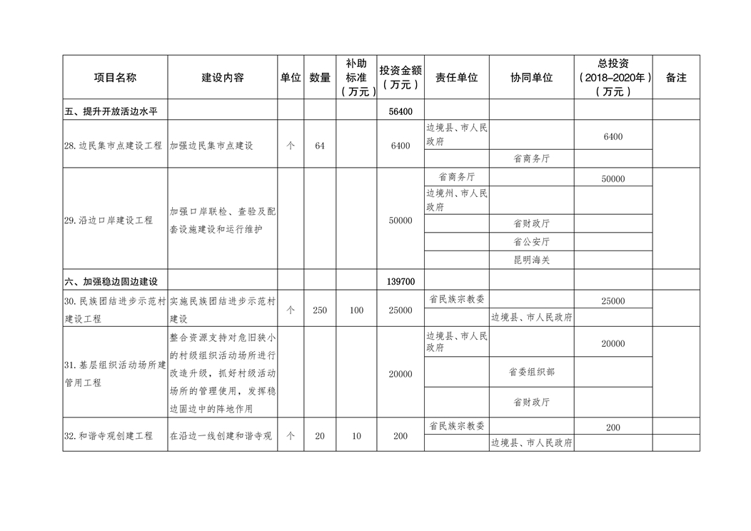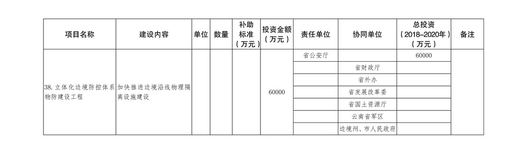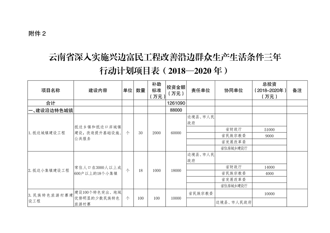 以上6项任务38项工程,3年总投入1261090万元。 三、组织实施 (一)加强组织领导 成立云南省深入实施兴边富民工程改善沿边群众生产生活条件三年行动计划工作领导小组,下设办公室在省民族宗教委。成员单位由省直有关部门和中央驻滇有关单位、云南省军区、省公安边防总队组成。领导小组成员单位及时安排部署三年行动计划建设任务,指导和督促边境州、市、县落实到位。边境州、市、县人民政府要进一步完善沿边三年行动计划工作领导小组,确保三年行动计划如期完成。边境县、市人民政府承担主体责任,县、市长为第一责任人,负责行动计划的落实。 (二)加大资金投入 省财政筹措资金支持抵边小城镇、集镇建设,同时积极争取中央财政加大对边境地区财政转移支付力度。省直有关部门将有关工程资金投入任务及时纳入本部门年度计划优先安排。边境州、市、县统筹各级各部门资金,加大对沿边地区支持力度。引导社会资金加大投入,发挥群众建设主体作用,发动边民投工投劳。 (三)健全机制保障 建立工作推进会议制度,省深入实施兴边富民工程改善沿边群众生产生活条件三年行动计划工作领导小组适时召开工作推进会议,领导小组办公室每年定期、不定期召开工作协调会议,部署和推进工作。建立规划先行制度,围绕三年行动计划目标和任务,边境州、市要制定实施意见,边境县、市要制定实施计划,边境乡镇要制定建设规划。完善对口帮扶和社会帮扶机制,深入实施东西部扶贫协作,推动东部地区人才、资金、技术向沿边一线贫困地区倾斜支持。 (四)强化督查考核 省深入实施兴边富民工程改善沿边群众生产生活条件三年行动计划工作领导小组办公室商省政府督查室,负责对行动计划实施情况开展监督检查和考核,每年对省直有关部门和边境州、市、县人民政府任务完成情况进行考核,考核情况专题报告省人民政府,对完不成任务的省直部门和州、市、县人民政府给予通报批评。加强计划年度目标任务完成情况督查,组织开展计划实施情况评估,定期向省人民政府报告。每季1通报,每年1考核,3年总考核,确保如期完成三年行动计划确定的目标任务。 附件:1.云南省110个沿边乡镇、21个抵边乡镇、9个抵边口岸、19个沿边农场和18个抵边小集镇名单 2.云南省深入实施兴边富民工程改善沿边群众生产生活条件三年行动计划项目表(2018—2020年)